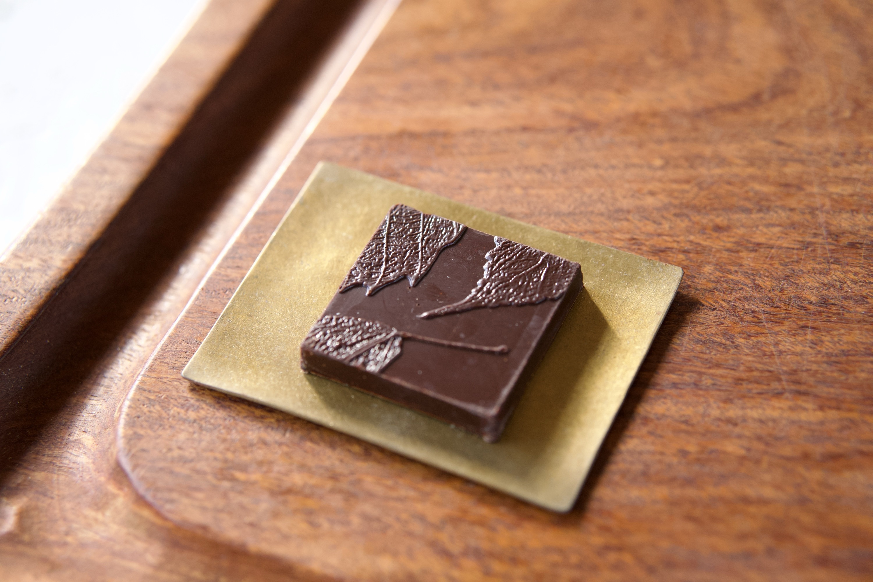 葉を型取ったチョコレートは単一産地のカカオ豆から丁寧に製作して作られたダークミルクチョコレート64%